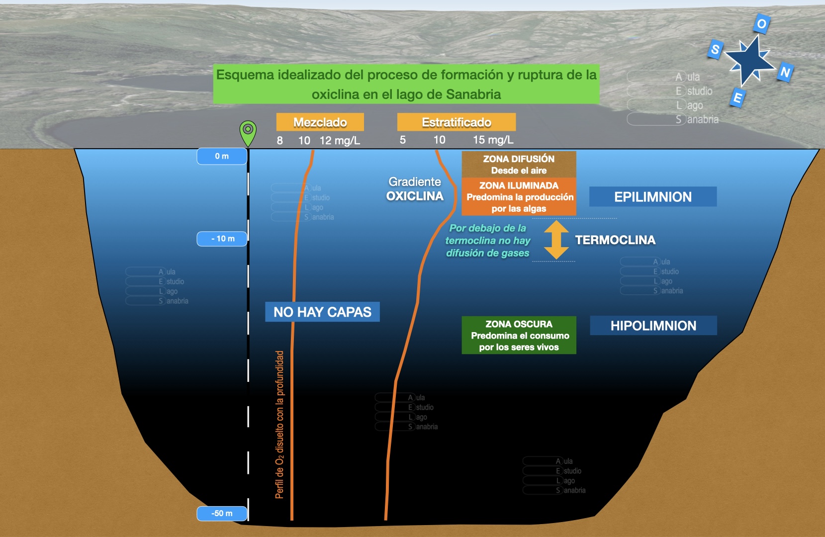 Por lo tanto en las capas superficiales, por encima de la termoclina, predomina la difusión y la producción y aunque los seres vivos que allí viven consumen al respirar algo de oxígeno el balance es positivo. Se produce un gradiente llamado oxiclina. Por debajo de la temoclina el agua está más fría y es más densa, y además la luz se extingue. Cuanto más profundo menos posible es realizar fotosíntesis, de manera que en estas capas más profundas del hipolimnion predomina el consumo del oxígeno. Y además permanecen aisladas de las superficiales hasta que se rompa la estratificación y con la mezcla invernal llega a las zonas profundas agua con oxígeno disuelto.